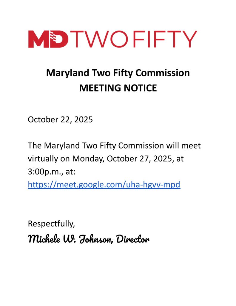 The Maryland Two Fifty Commission will meet virtually on Monday, October 27, 2025, at 3:00p.m., at: https://meet.google.com/uha-hgvv-mpd