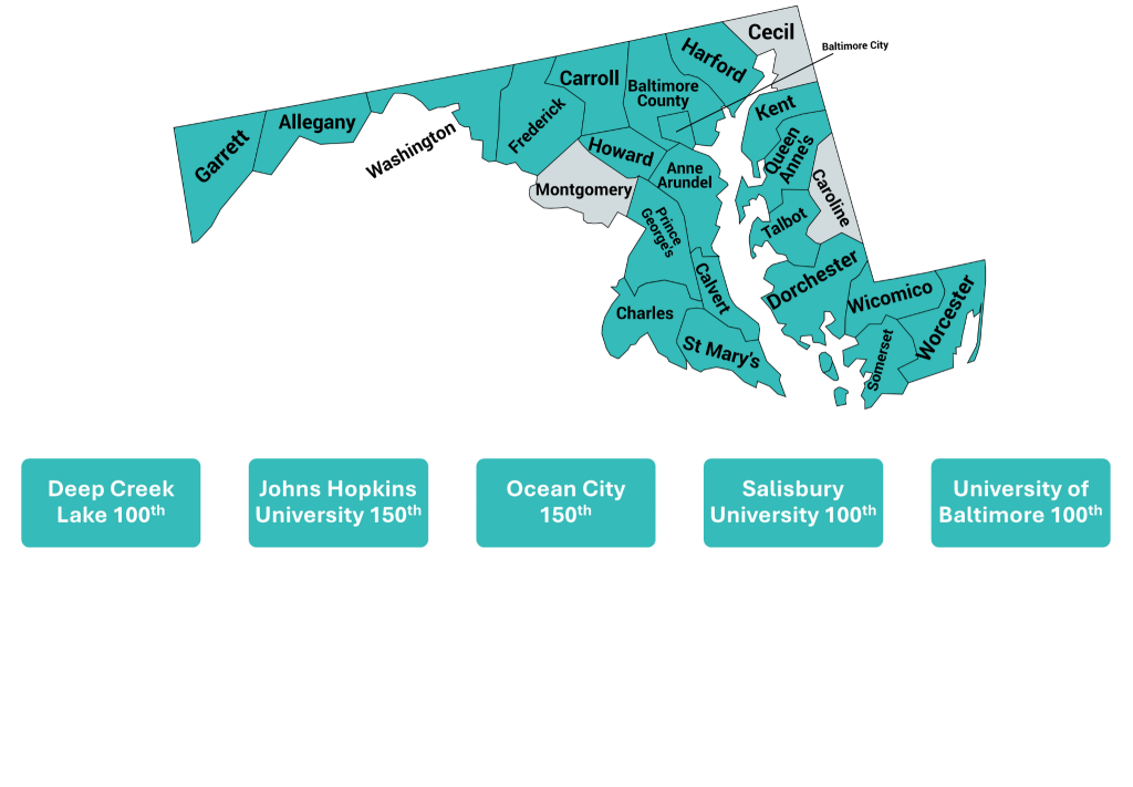 Explore 250th commissions, committees, and initiatives across Maryland below. If you are launching a local 250th committee in your community or within your affinity group, please send us your information and check back for updates as additional groups launch.
